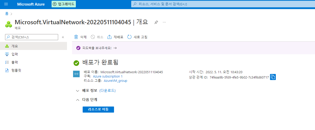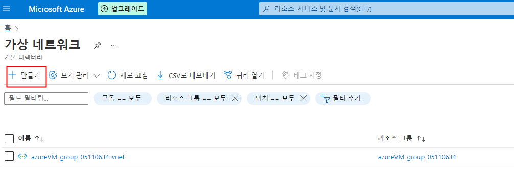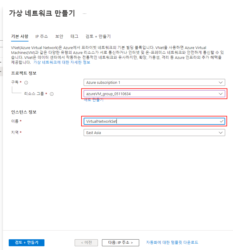 리소스 그룹명(VM에서 생성한 그룹), 이름을 입력합니다.
