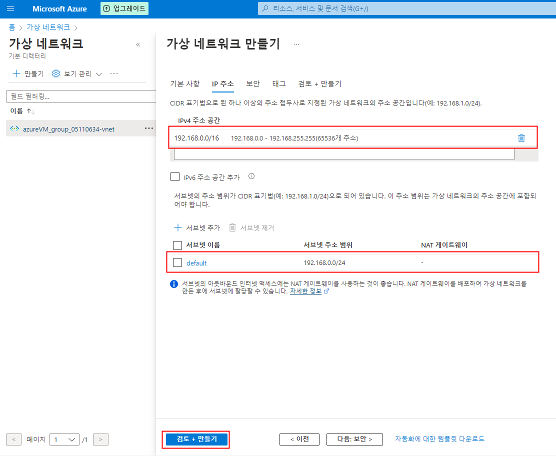 아래에 IPv4 주소 공간과 서브넷 이름을 입력합니다.