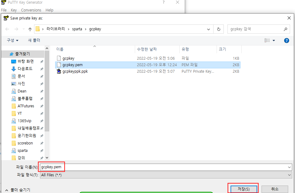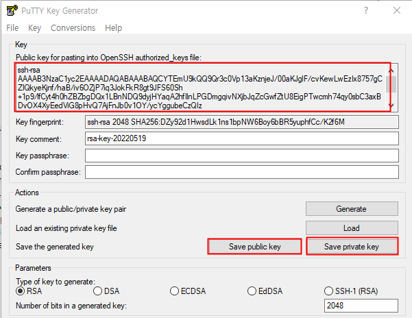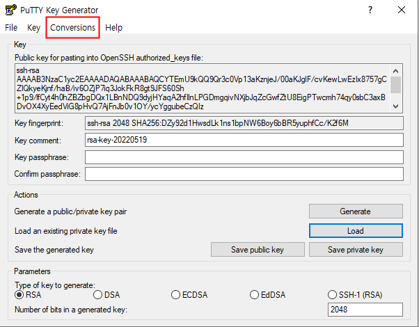생성한 키쌍중에서 public key(*.ppk)를 pem 파일로 변환합니다.