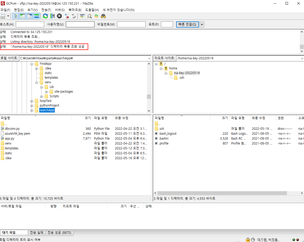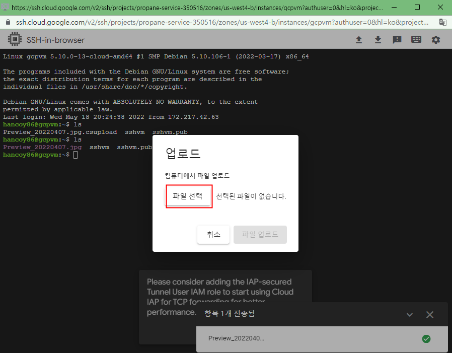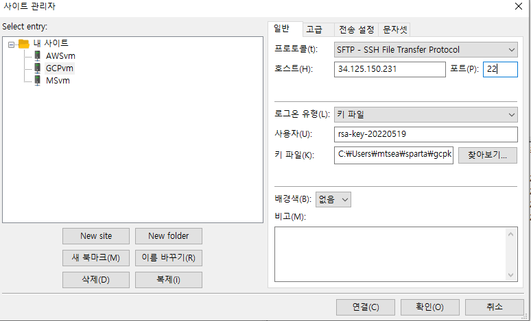 ssh -i gcpkey.pem rsa-key-20220519@{IP주소}