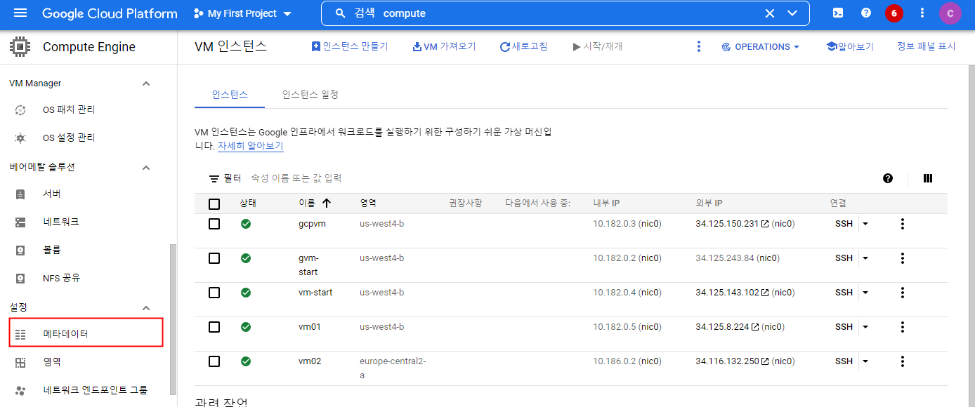첫번째 빨간색 박스에 생성된 키값을 GCP 콘솔에 접속->메타데이터에 입력합니다.