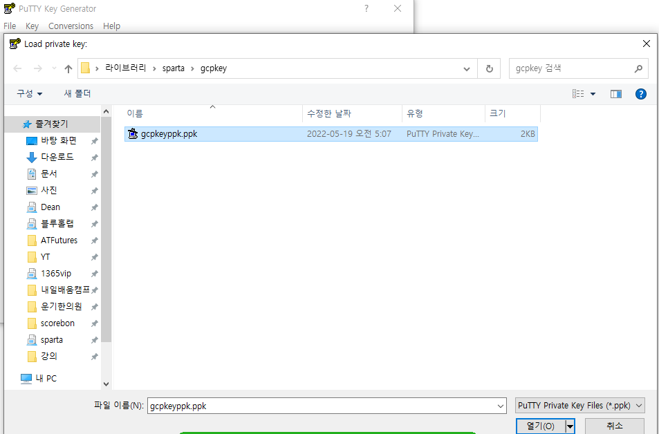 생성한 키쌍 중에서 ~.ppk파일을 불러옵니다.