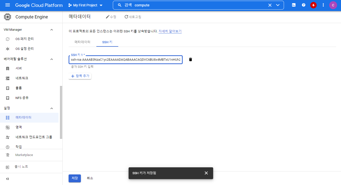 메타데이터에 메뉴접속해서 SSH키값에 복사한 키값을 입력 후, 저장 버튼을 누릅니다.