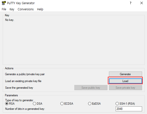 putty gen을 실행합니다. Load 버튼을 누릅니다.