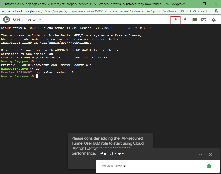 ssh -i gcpkey.pem rsa-key-20220519@{IP주소}